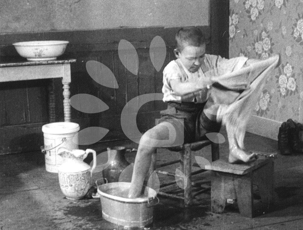 On retrouve le même décor et le même jeune homme que dans la vue n°5599, "Nettoyage des dents et de la bouche".
